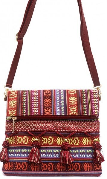 Schattige boho kwastjes op mooi geweven jacquard en rits aan de bovenkant die vervolgens omgeslagen wordt