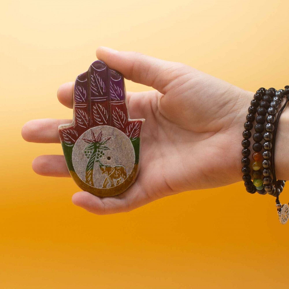 Prachtig bewerkte wierookhouder van zeepsteen in de vorm van een Hamsa hand.