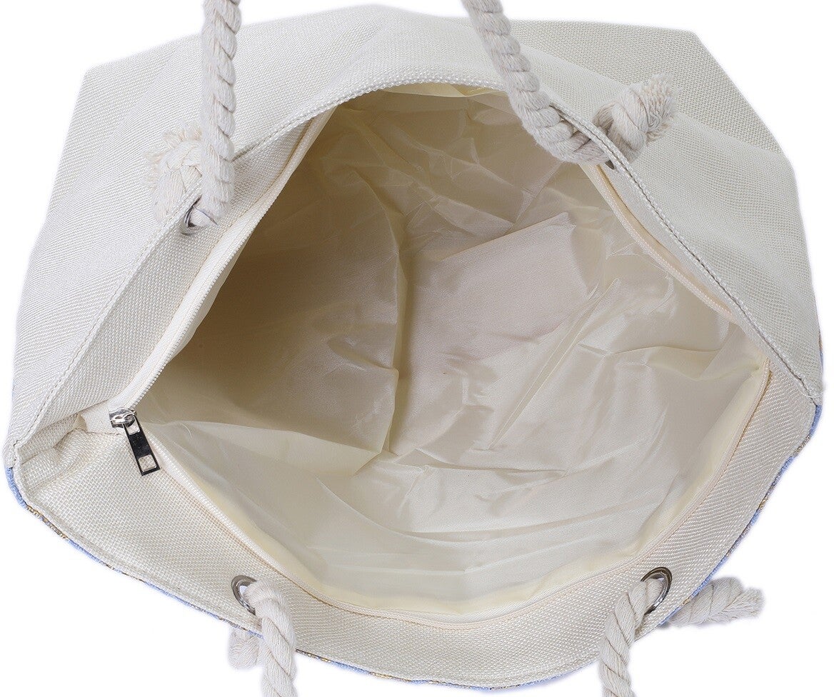 Gezellige shopper/strandtas met lichtblauw bloemenpatroon en sisalkleurige onderkant