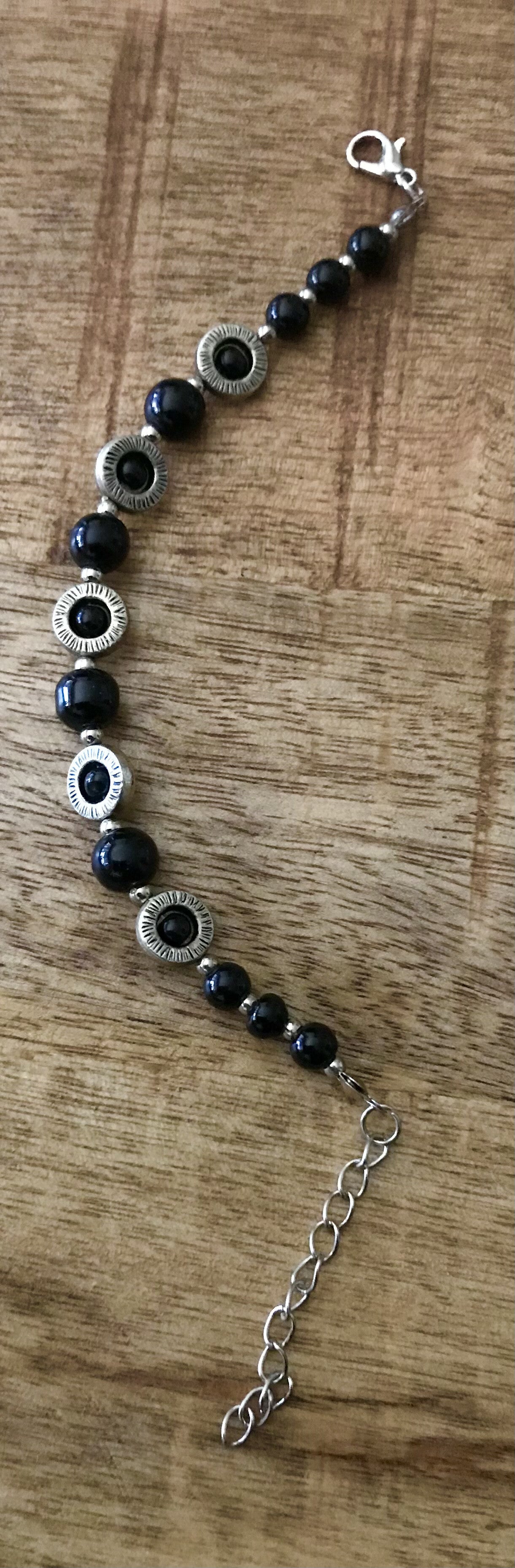 Armbandje met zwarte kraaltjes en rondjes in Tibetaans zilver