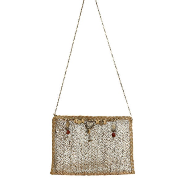 De zomerse clutch met zilveren details is met de hand gemaakt van plantaardige vezels (jute). Het is een hippe zomerse tas die je op veel verschillende manieren kan stijlen. De tas kan je met de hand bij je dragen of je kan hem om je schouder heen dragen.