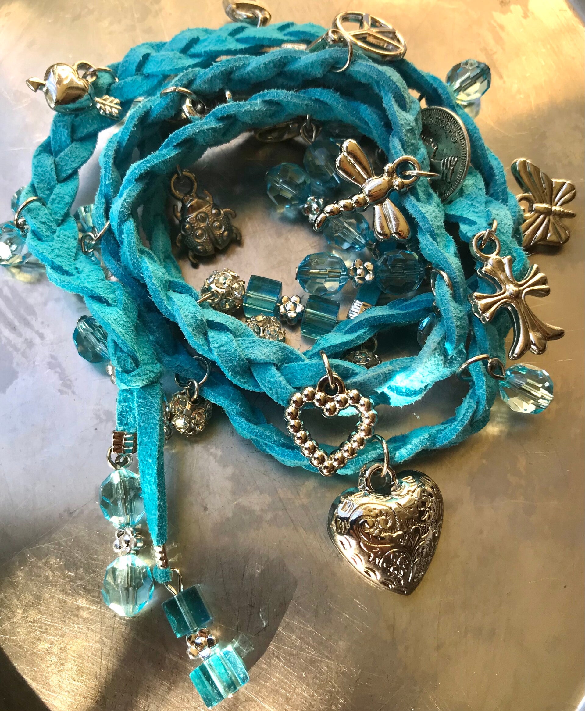 De wikkelarmband hangt vol met zilverkleurige bedeltjes