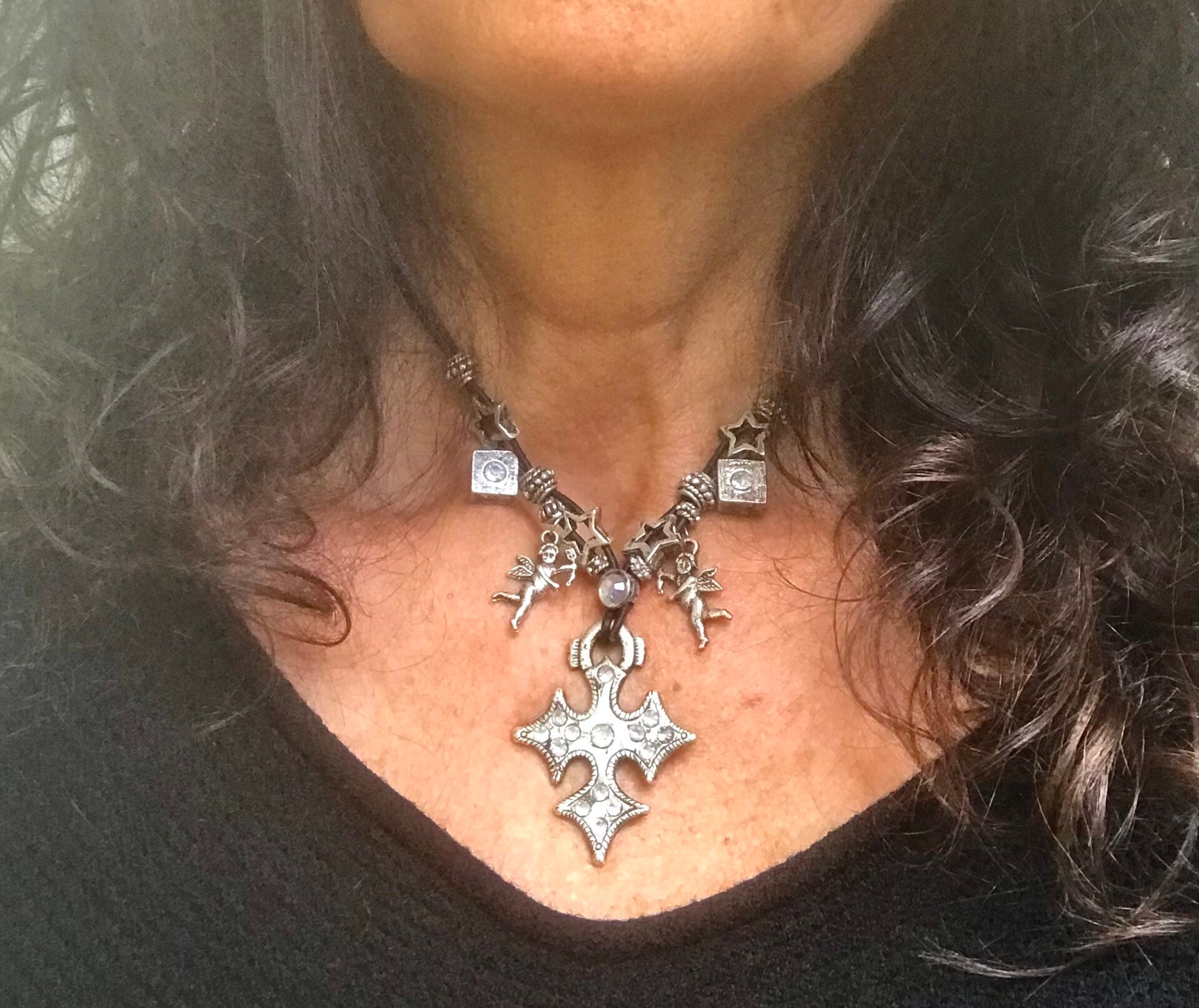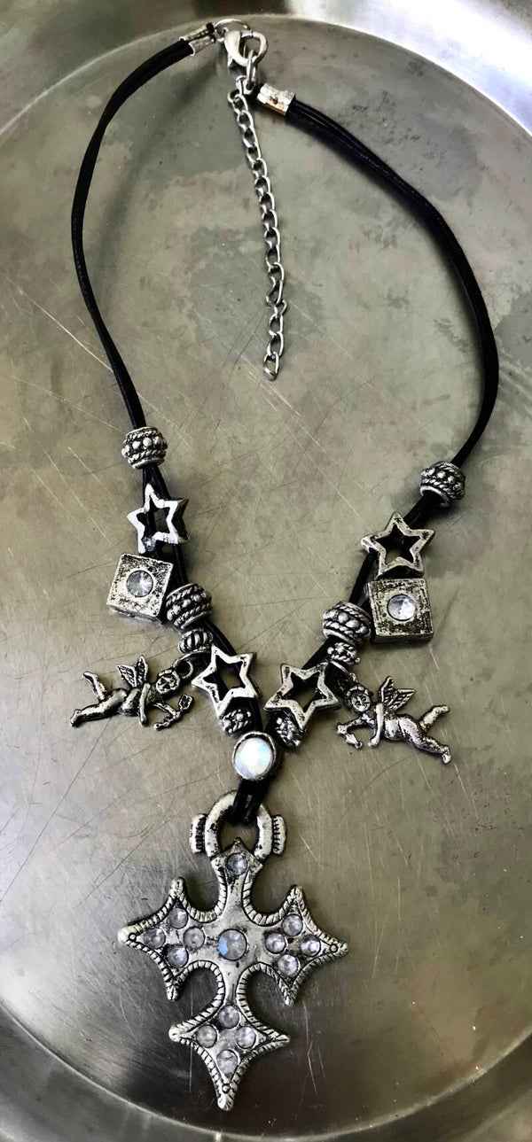 Aparte korte fantasy/gothic halsketting met een keltisch kruis in antieke zilverkleur aan een dubbel zwart koord