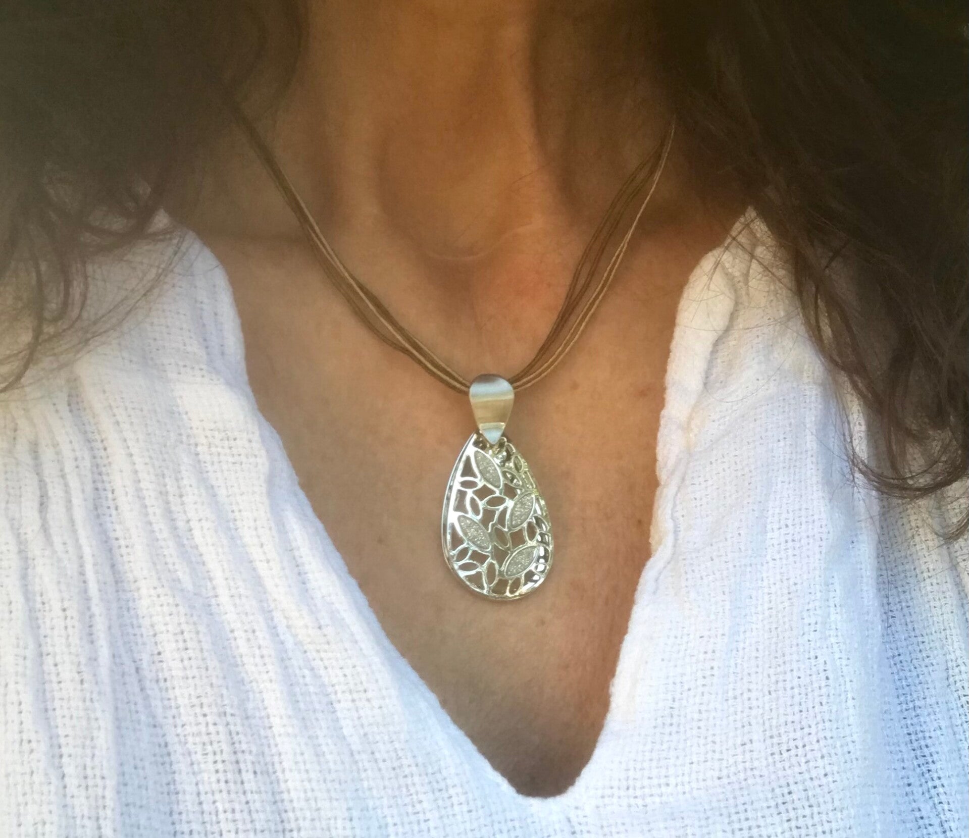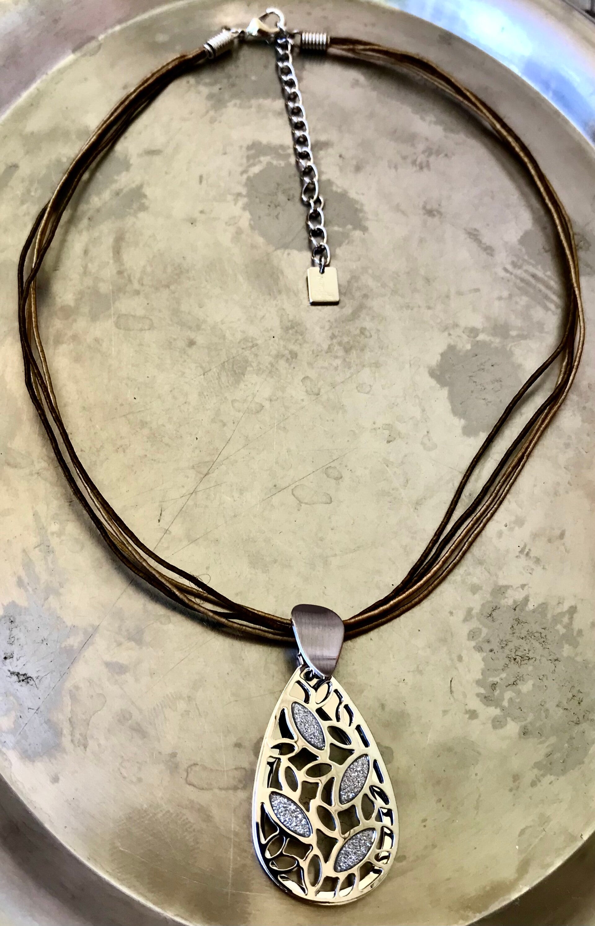 Zilverkleurig hangertje aan vier dunne koordjes