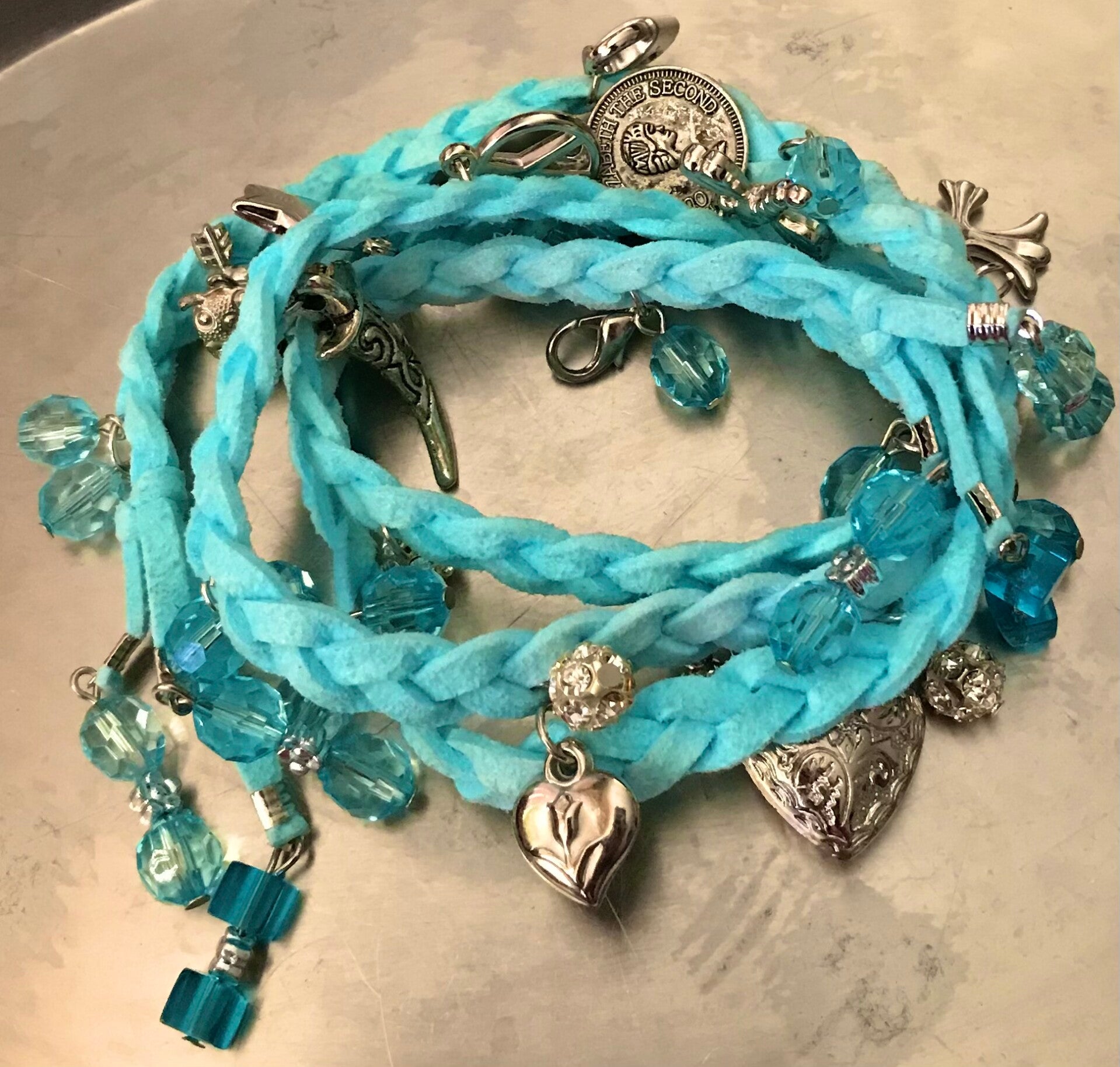 De wikkelarmband hangt vol met zilverkleurige bedeltjes