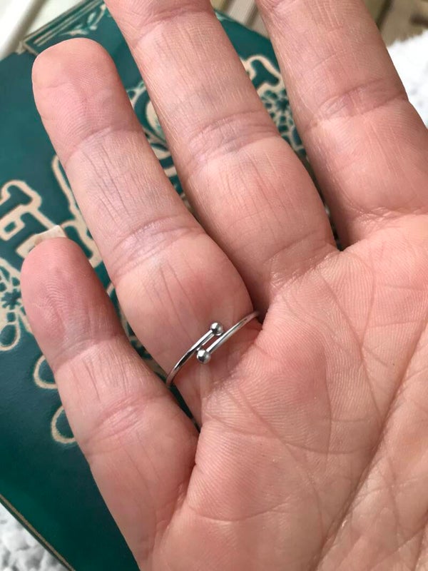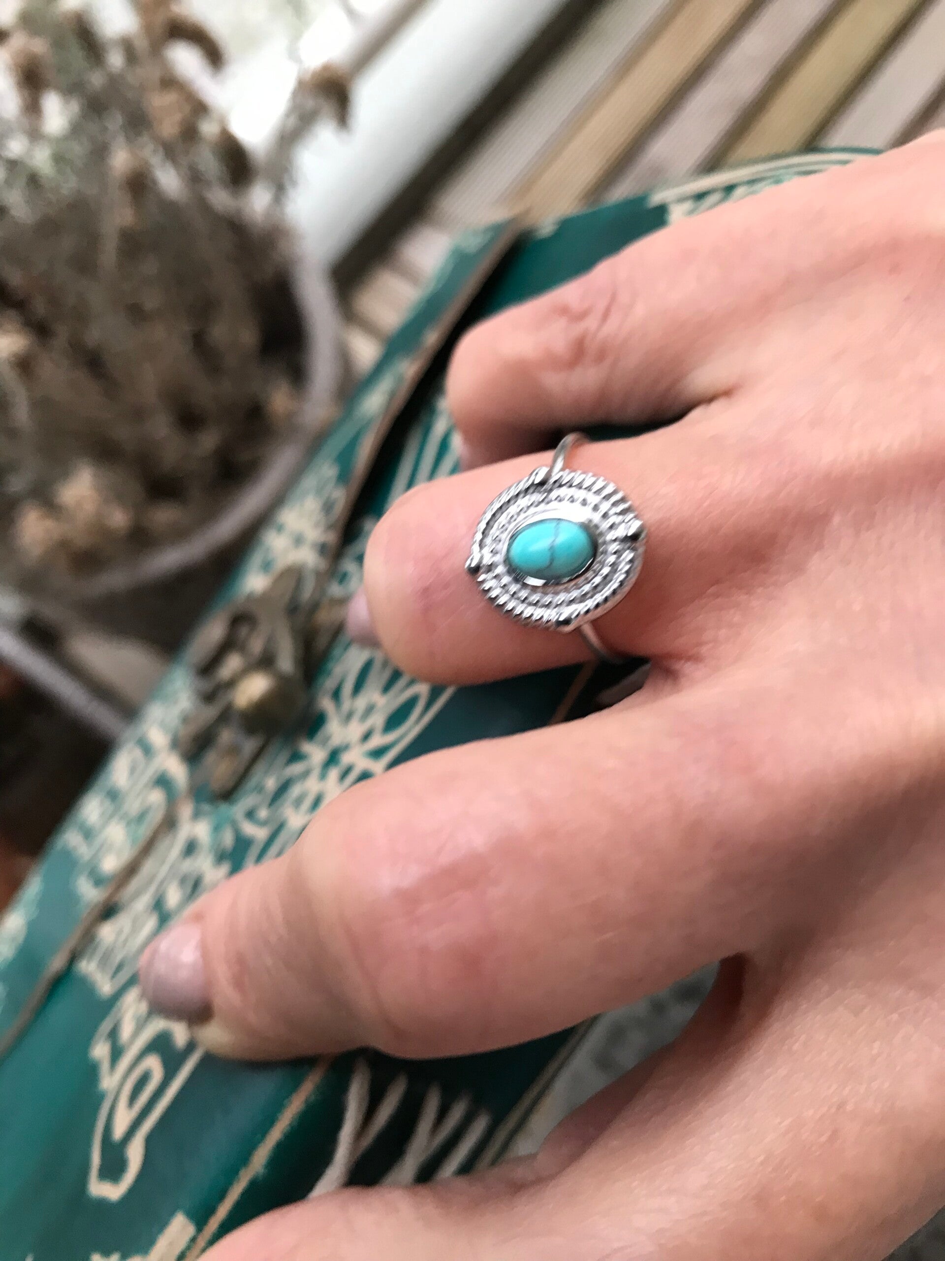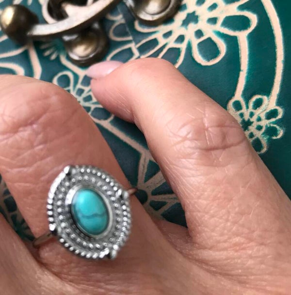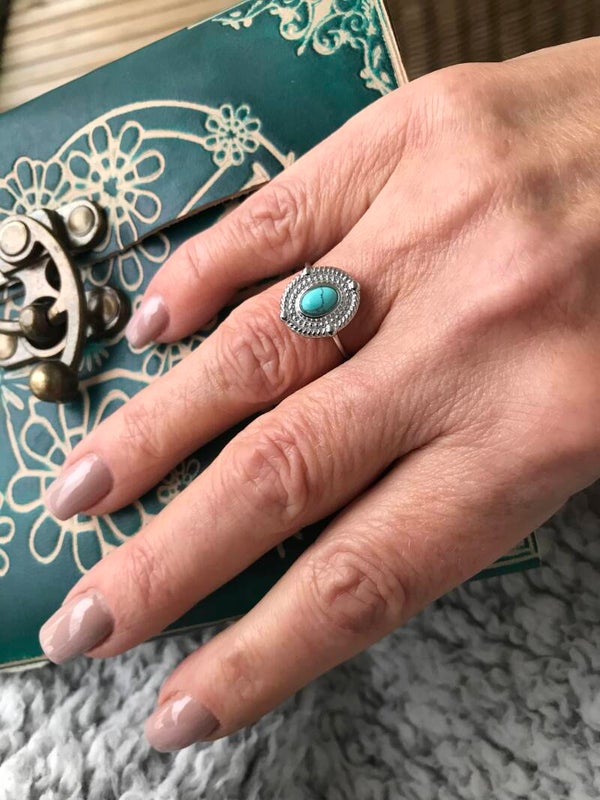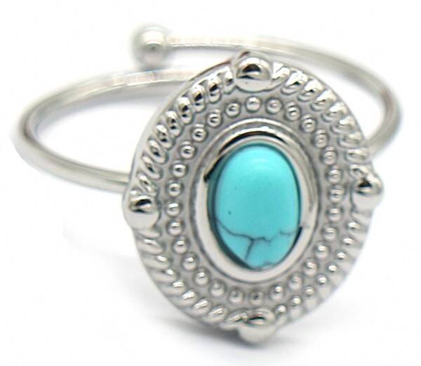 Verstelbare zilverkleurige stalen ring met turqouise steentje in medaillon